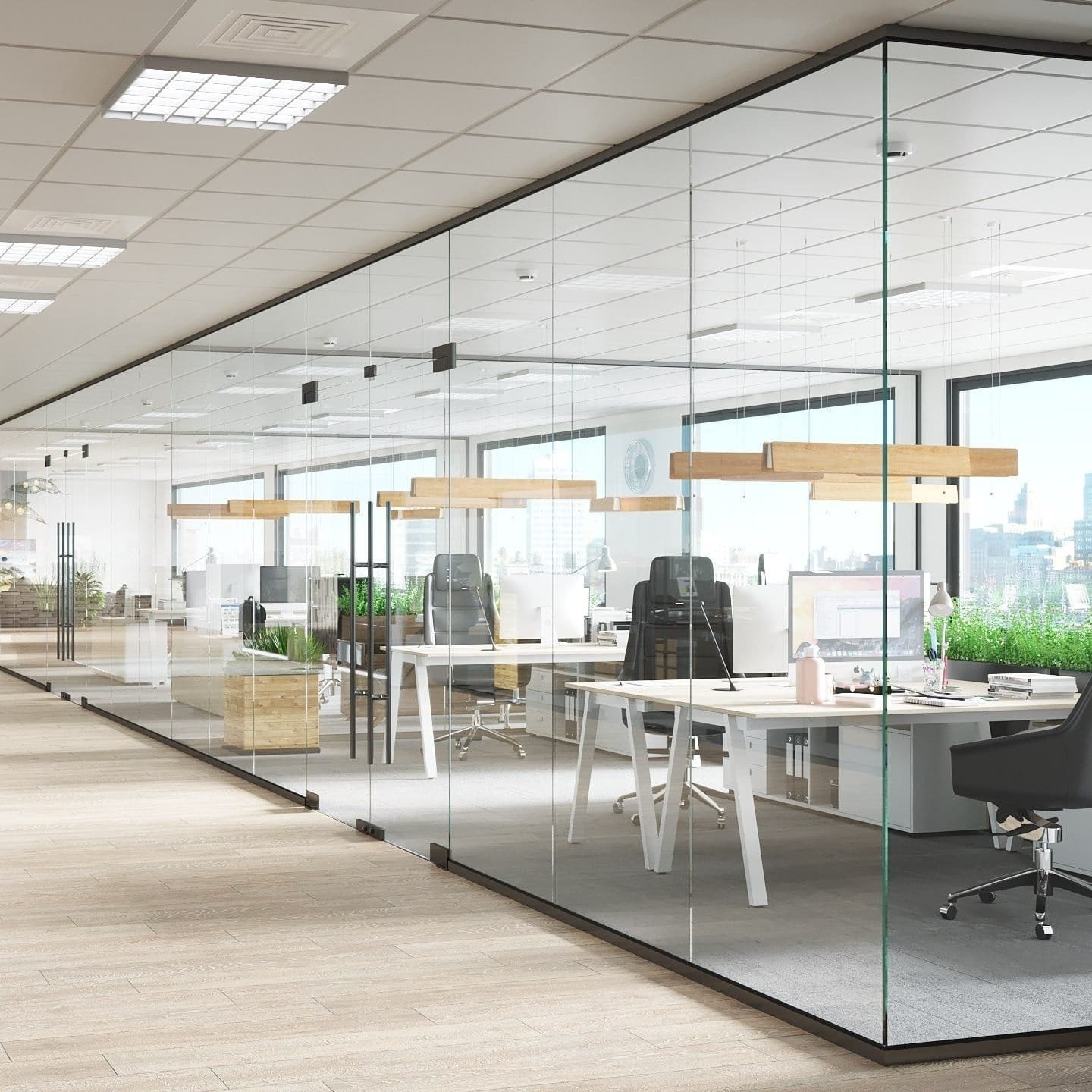 Ідеальний варіант для переговорних кімнат, кабінетів керівників та офісів, де важлива конфіденційність. Перегородки із матового або тонованого скла частково або повністю обмежують огляд. Плюси: