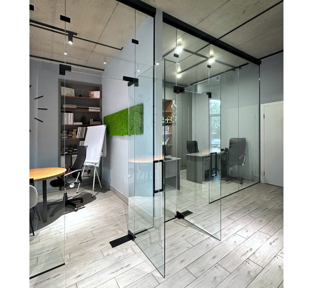 • Тип та товщина скла. Товщина скла впливає на міцність, безпеку та акустичні властивості конструкції. Найчастіше використовують полотно завтовшки від 8 до 12 мм. Загартоване скло – універсальний варіант для більшості офісів, триплекс вибирають там, де у пріоритеті максимальна безпека та звукопоглинання.