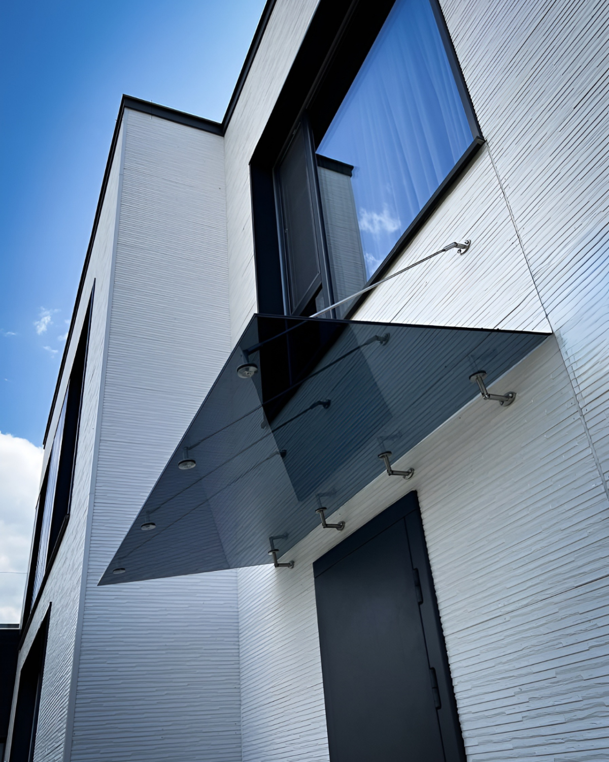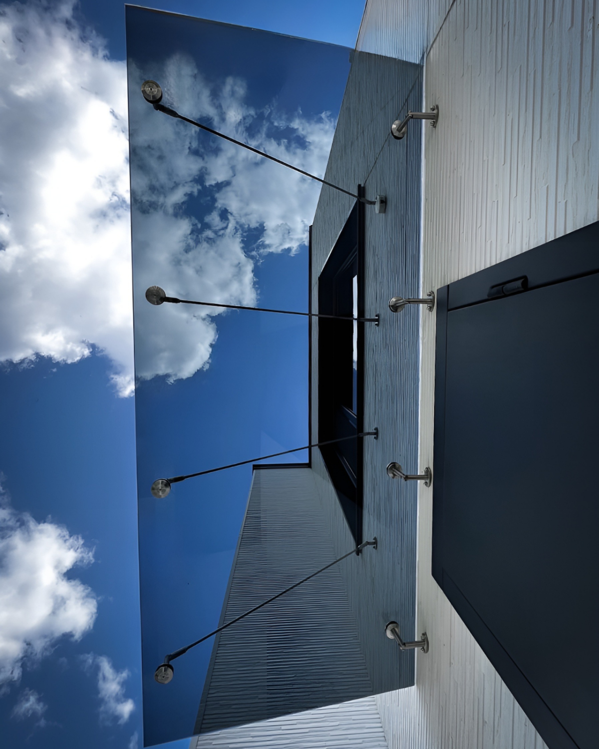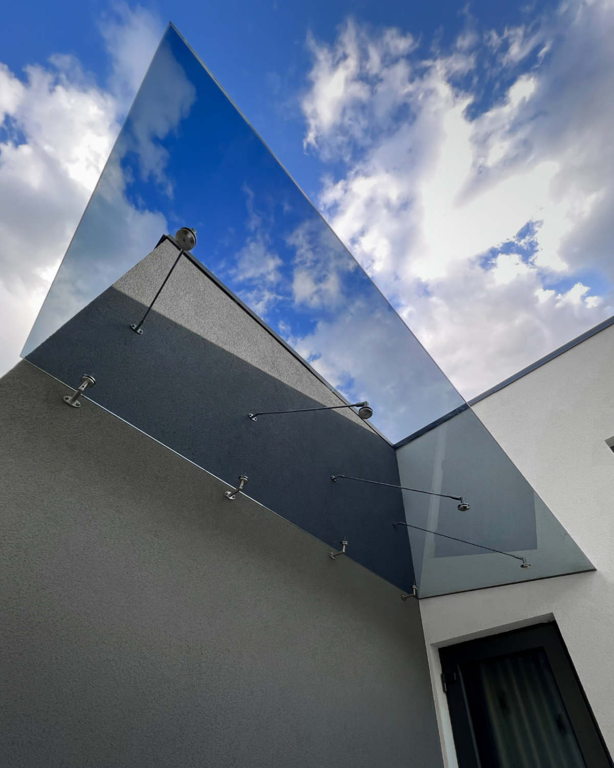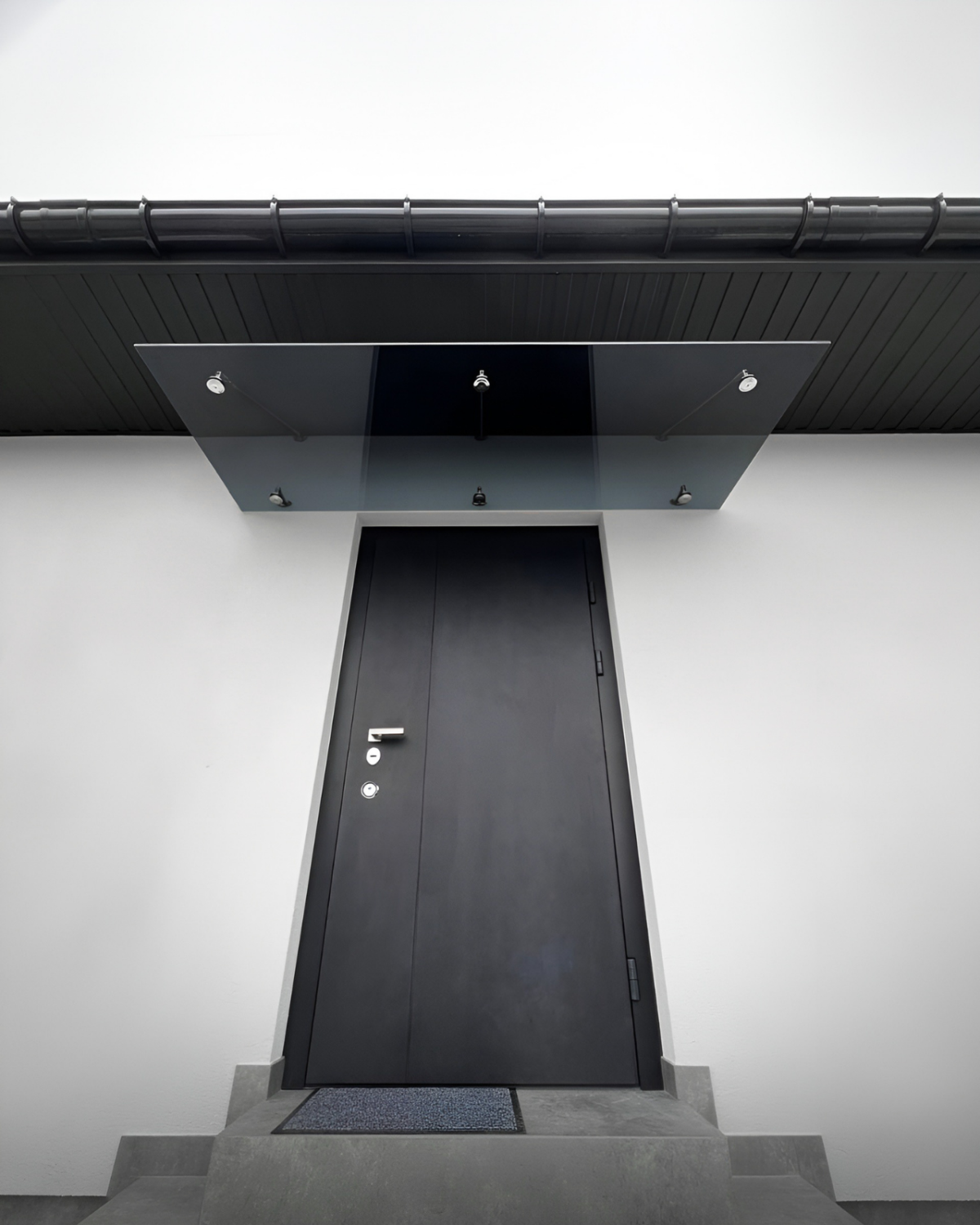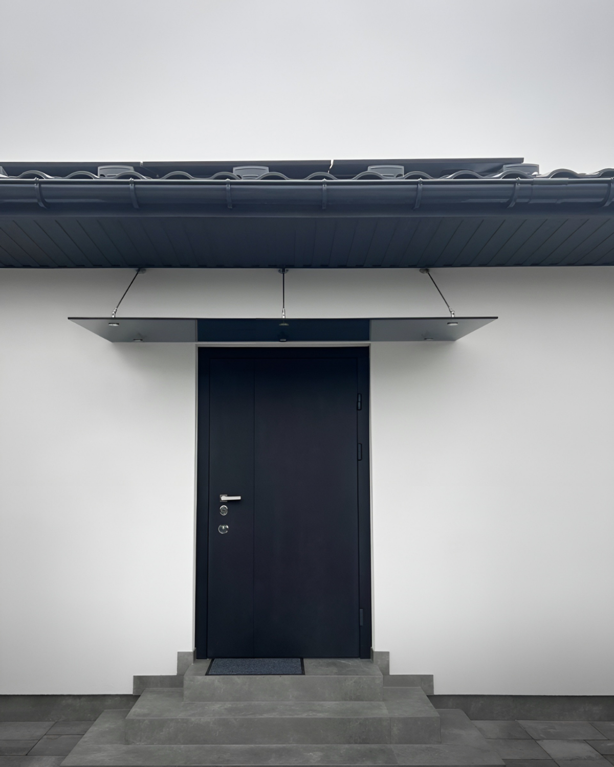 Навіси над вхідними дверима – це елемент, який повинен бути виготовлений з міцних матеріалів, тому ми використовуємо спеціальне загартоване скло та багатошарове скло триплекс.