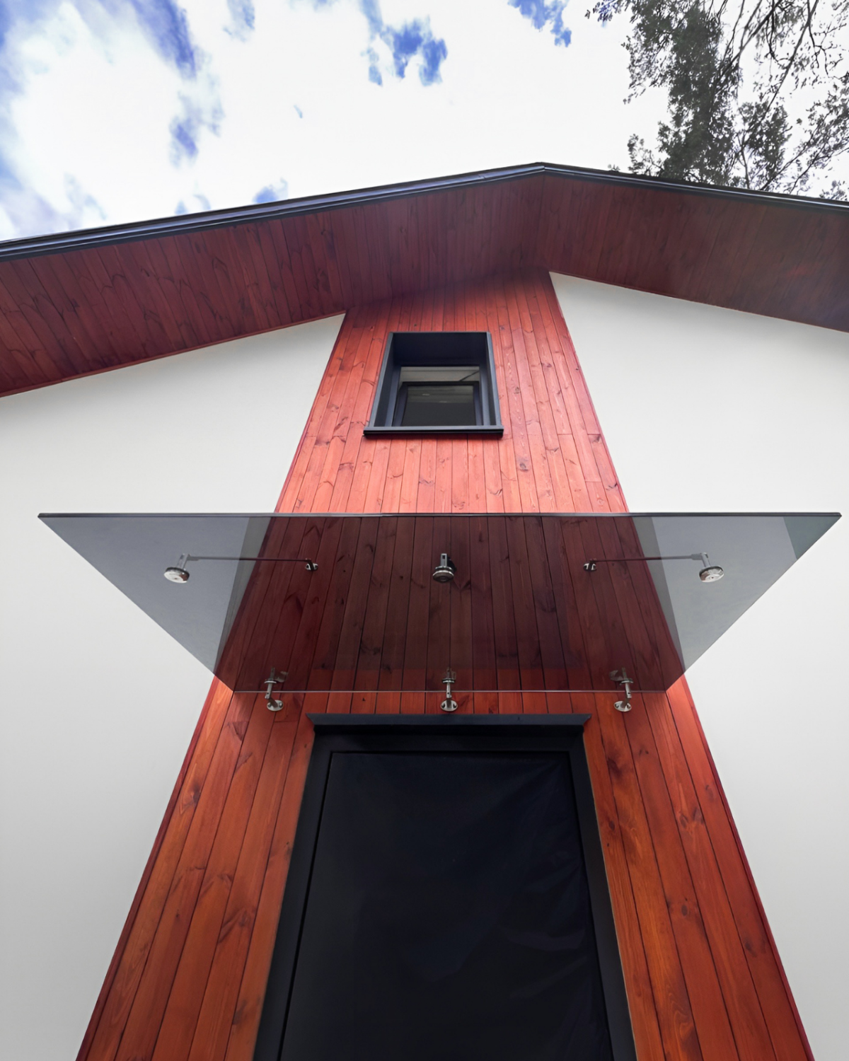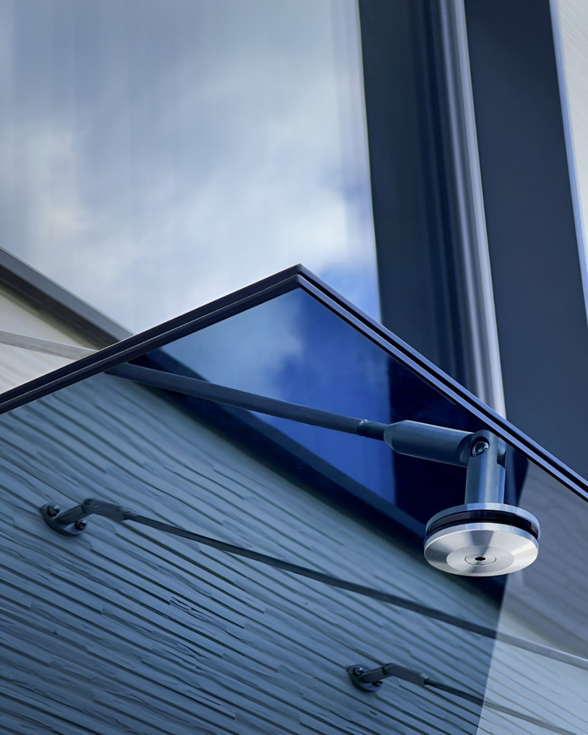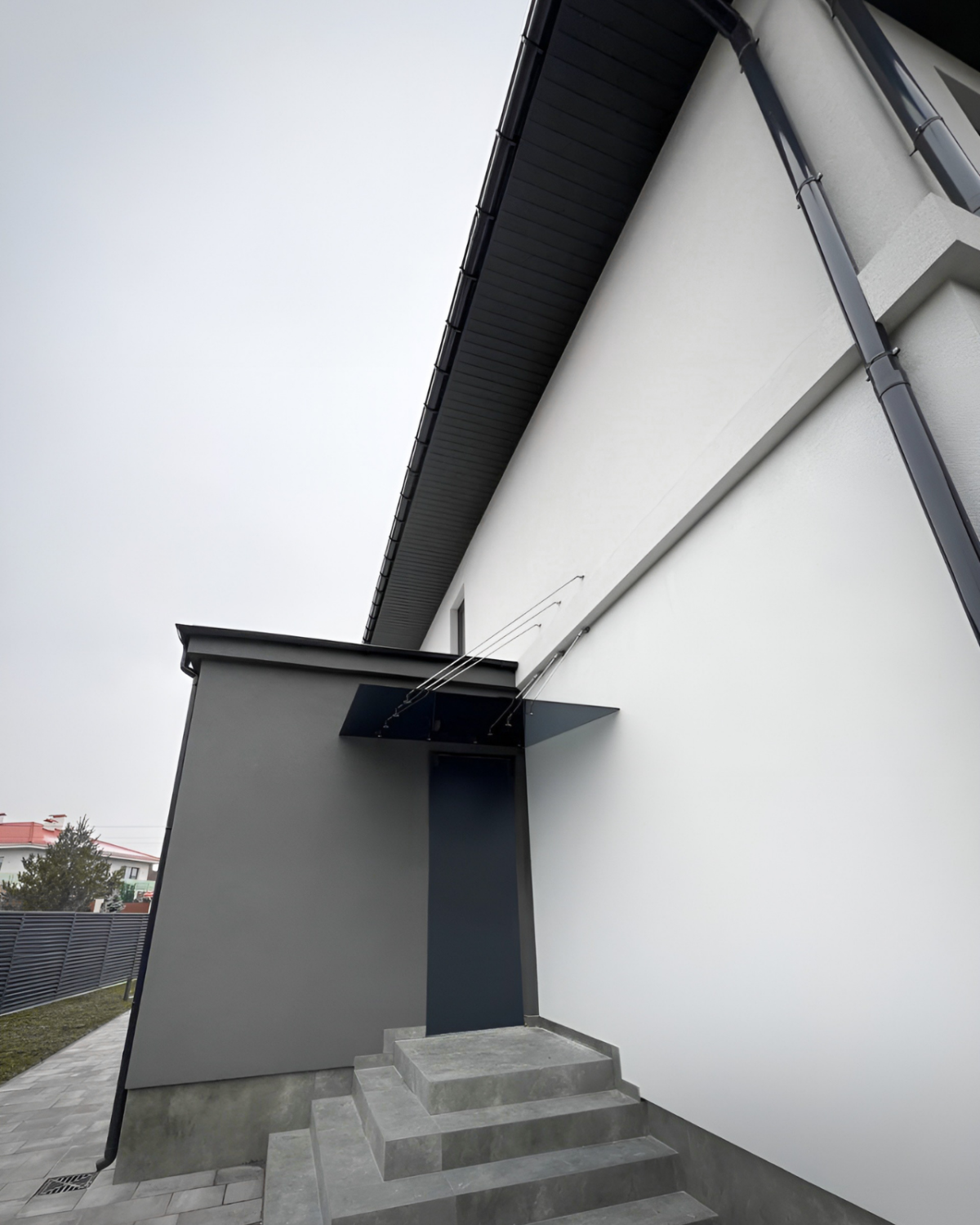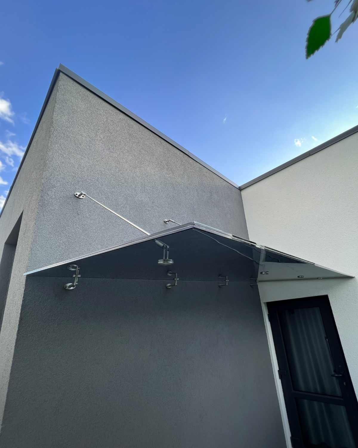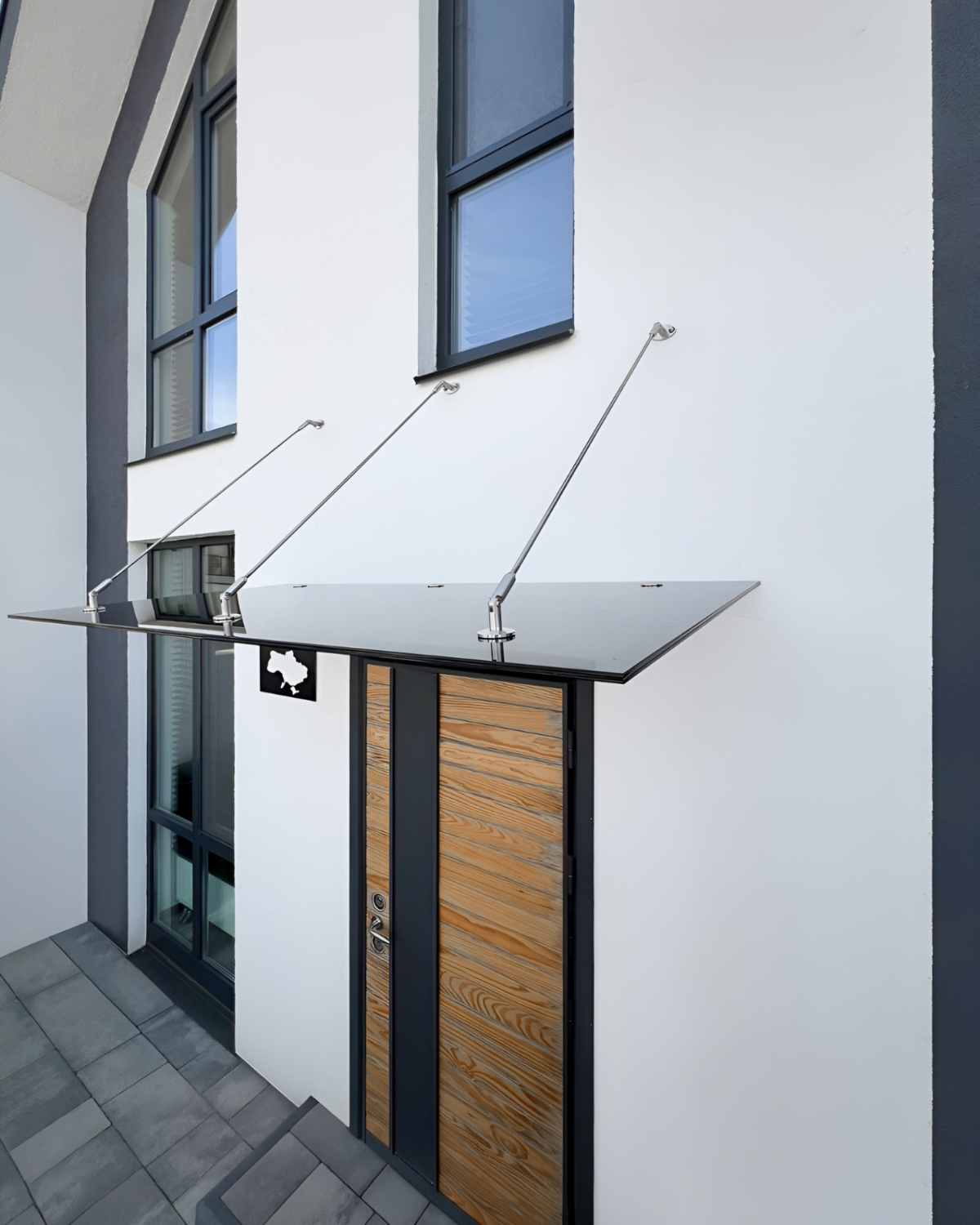 Навіси над вхідними дверима – це елемент, який повинен бути виготовлений з міцних матеріалів, тому ми використовуємо спеціальне загартоване скло та багатошарове скло триплекс.