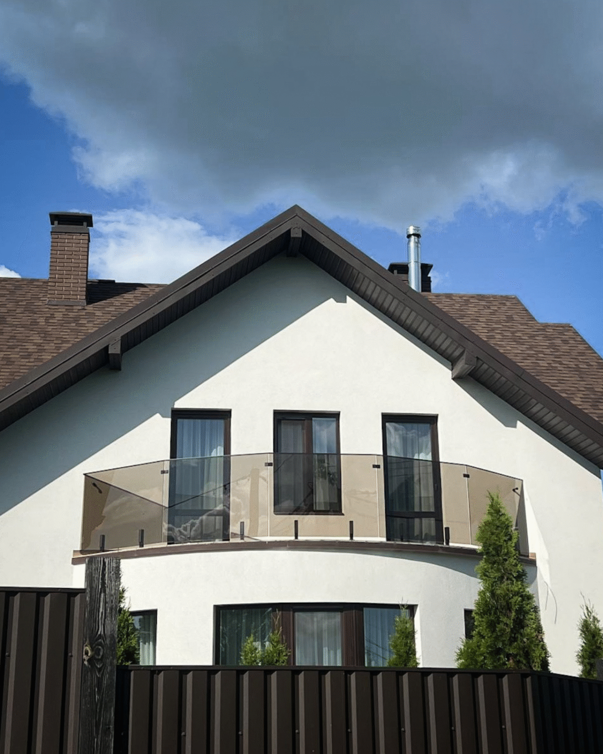 скляне огородження на балкон чи терасу на підсилених стійках чорного кольору із загартованого тонованого скла бронза”“