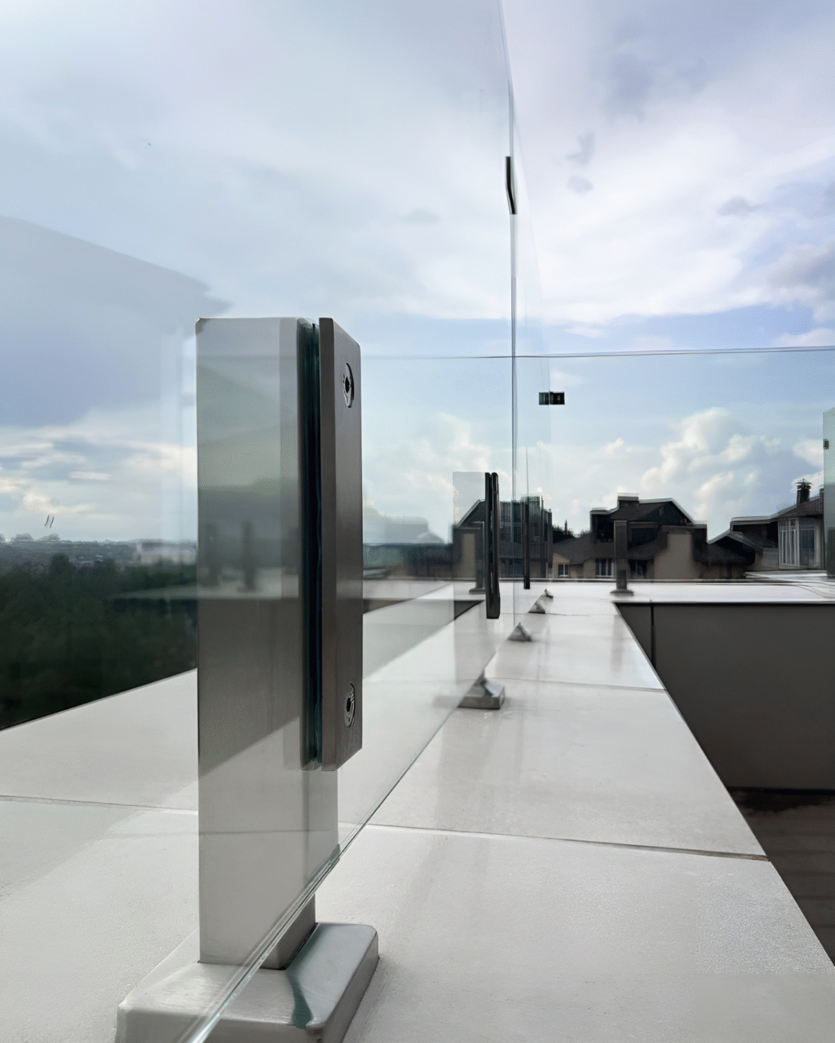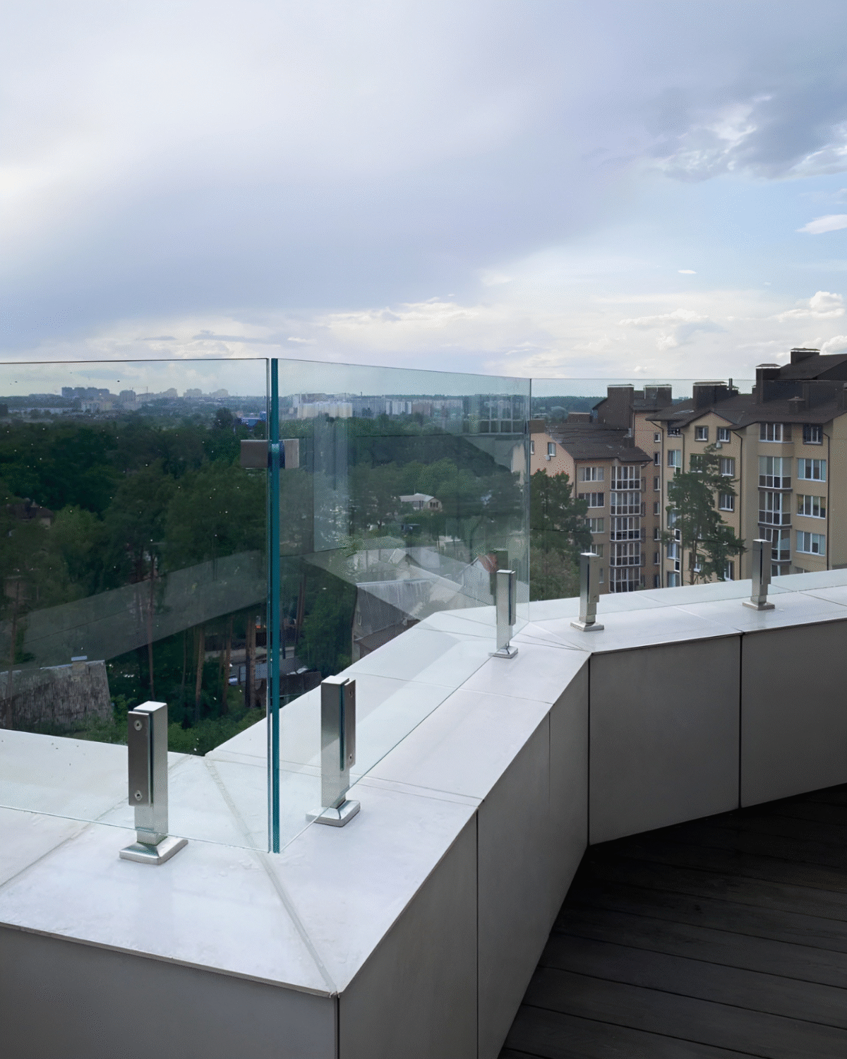 Оброблена кромка скляних огорож безпечна, а зовнішній вигляд скла та його строгі прямі лінії дозволяють створювати неймовірні архітектурні шедеври.